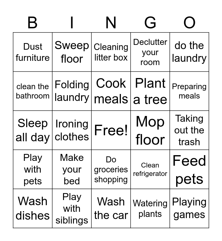 This bingo card has a free space and 25 words: Make your bed, Wash the car, Cook meals, Wash dishes, do the laundry, Dust furniture, clean the bathroom, Sweep floor, Mop floor, Do groceries shopping, Plant a tree, Sleep all day, Clean refrigerator, Feed pets, Folding laundry, Helping parents, Taking out the trash, Cleaning litter box, Preparing meals, Ironing clothes, Playing games, Play with siblings, Play with pets, Declutter your room and Watering plants.