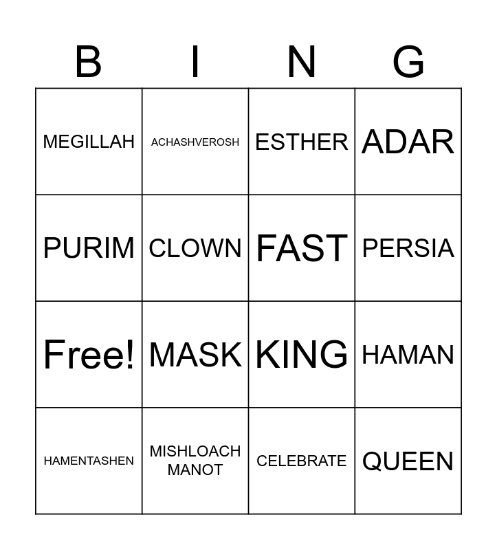 This bingo card has 20 words: HAMAN, VASHTI, ESTHER, MORDECHAI, HAMENTASHEN, PURIM, MISHLOACH MANOT, MEGILLAH, Free!, ACHASHVEROSH, MASK, KING, CLOWN, QUEEN, FAST, UNCLE, PERSIA, ADAR, CELEBRATE and MAKE NOISE.