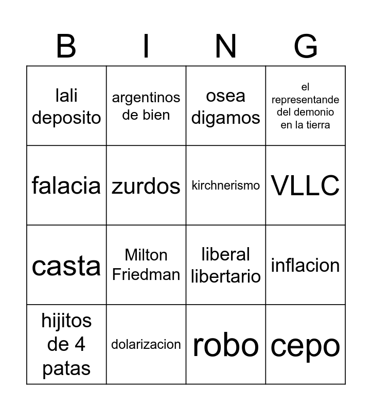 This bingo card has 16 words: dolarizacion, inflacion, osea digamos, lali deposito, casta, argentinos de bien, liberal libertario, robo, falacia, zurdos, hijitos de 4 patas, el representande del demonio en la tierra, Milton Friedman, VLLC, kirchnerismo and cepo.