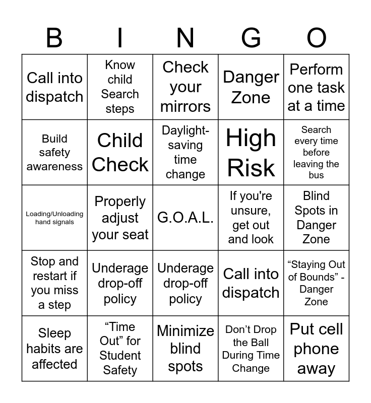 This bingo card has a free space and 28 words: Distraction free, Underage drop-off policy, Daylight-saving time change, Don’t Drop the Ball During Time Change, Perform one task at a time, Call into dispatch, Child Check, Minimize blind spots, If you're unsure, get out and look, “Staying Out of Bounds” - Danger Zone, Loading/Unloading hand signals, Properly adjust your seat, Call into dispatch, Put cell phone away, Build safety awareness, “Time Out” for Student Safety, Underage drop-off policy, Danger Zone, Search every time before leaving the bus, Sleep habits are affected, Know child Search steps, "Out of bounds", High Risk, Blind Spots in Danger Zone, Stop and restart if you miss a step, Properly adjust your mirrors, Check your mirrors and Keep your eyes moving.