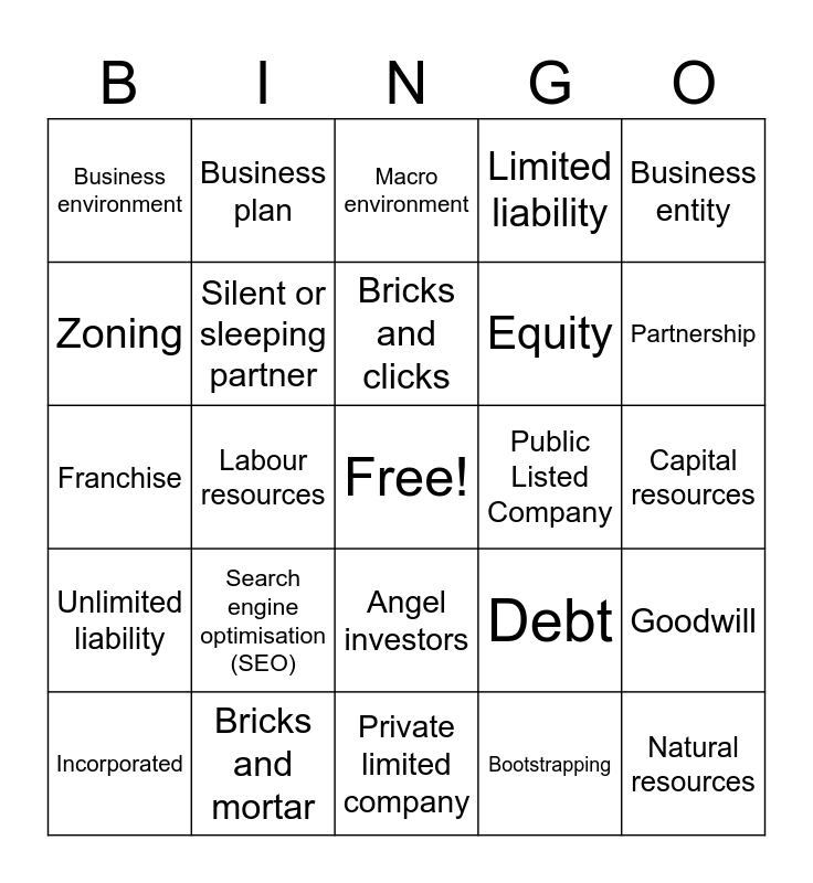 This bingo card has a free space and 26 words: Angel investors, Bootstrapping, Bricks and clicks, Bricks and mortar, Business entity, Business environment, Zoning, Business plan, Capital resources, Debt, Equity, Franchise, Goodwill, Incorporated, Labour resources, Leasing, Limited liability, Unlimited liability, Macro environment, Natural resources, Partnership, Private limited company, Public Listed Company, Search engine optimisation (SEO), Silent or sleeping partner and Sole trader.