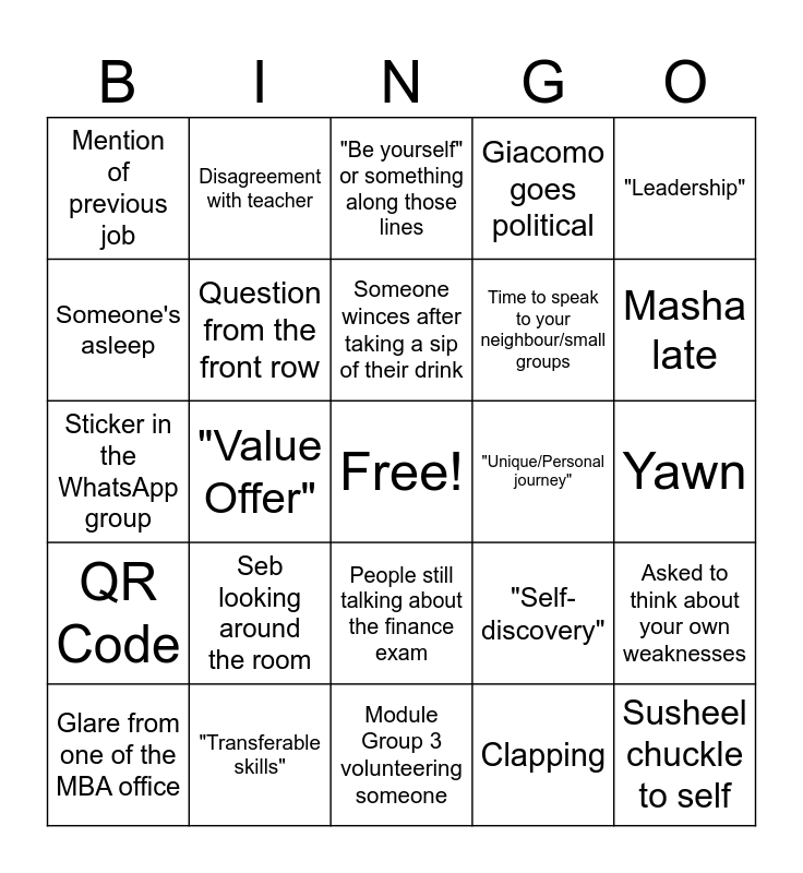 This bingo card has a free space and 29 words: Glare from one of the MBA office, "Career fulfillment", "Value Offer", Alvaro WhatsApp react, Mention of previous job, "Be yourself" or something along those lines, Question from the front row, Seb looking around the room, "Unique/Personal journey", "Transferable skills", Yawn, Susheel chuckle to self, Module Group 3 volunteering someone, Clapping, Masha late, "Personal value(s)", People still talking about the finance exam, QR Code, "Leadership", Sticker in the WhatsApp group, "Self-discovery", Arushi leaving randomly, Time to speak to your neighbour/small groups, Someone's asleep, Giacomo goes political, Disagreement with teacher, Asked to think about your own weaknesses, Someone winces after taking a sip of their drink and Someone's on TikTok/IG/YouTube.