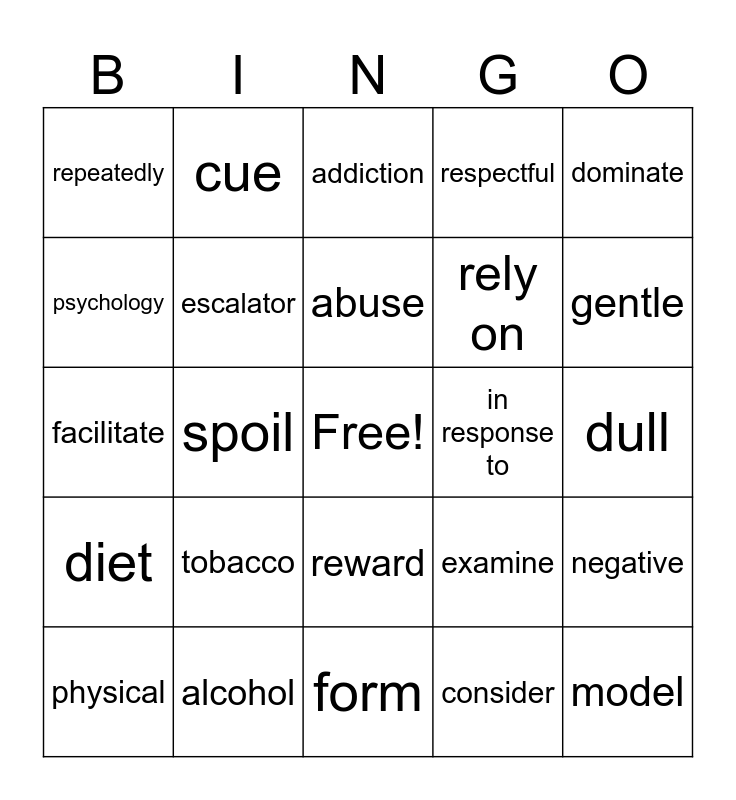 This bingo card has a free space and 24 words: tobacco, alcohol, abuse, physical, dominate, repeatedly, psychology, cue, in response to, reward, rely on, facilitate, examine, negative, escalator, consider, dull, addiction, gentle, spoil, model, diet, respectful and form.