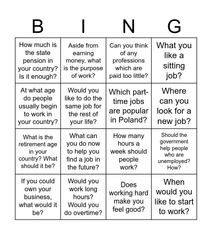 This bingo card has 16 words: Would you work long hours? Would you do overtime?, Should the government help people who are unemployed? How?, Can you think of any professions which are paid too little?, How much is the state pension in your country? Is it enough?, What is the retirement age in your country? What should it be?, Aside from earning money, what is the purpose of work?, How many hours a week should people work?, Does working hard make you feel good?, At what age do people usually begin to work in your country?, Would you like to do the same job for the rest of your life?, If you could own your business, what would it be?, What you like a sitting job?, What can you do now to help you find a job in the future?, Where can you look for a new job?, Which part-time jobs are popular in Poland? and When would you like to start to work?.