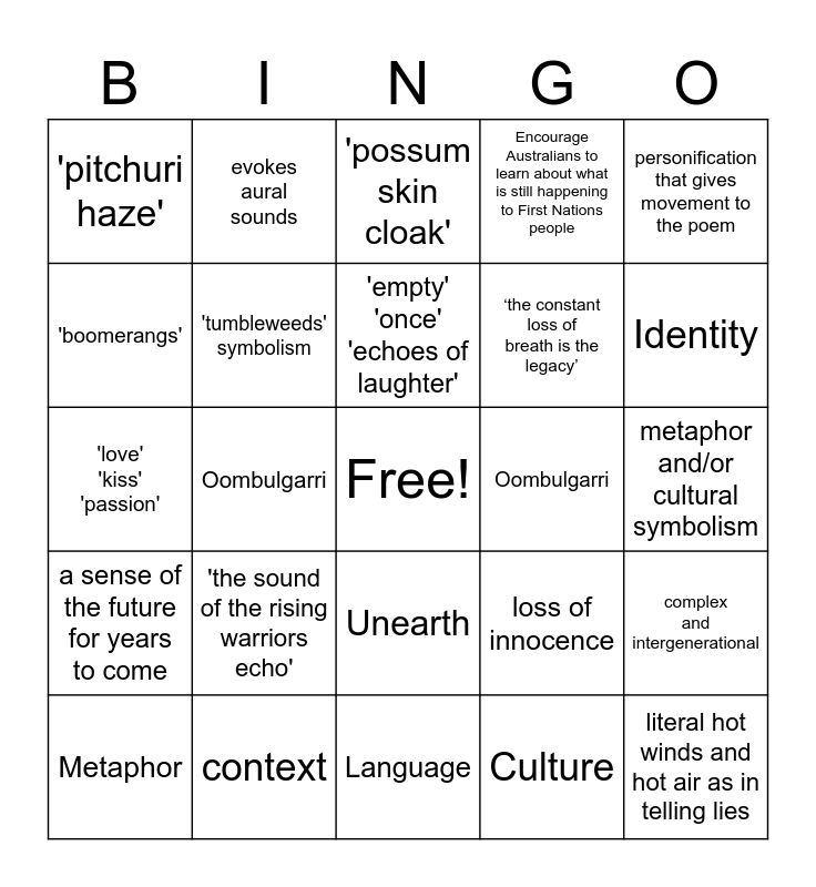 This bingo card has a free space and 29 words: Metaphor, Stolen Generation, Oombulgarri, Punctuation, 'pitchuri haze', 'possum skin cloak', 'tumbleweeds' symbolism, 'the sound of the rising warriors echo', Oombulgarri, context, metaphor and/or cultural symbolism, literal hot winds and hot air as in telling lies, Language, Culture, Identity, 'a people suppressed by dread', Unearth, a sense of the future for years to come, personification that gives movement to the poem, 'love' 'kiss' 'passion', loss of innocence, desertion, static energy and stillness, ‘the constant loss of breath is the legacy’, 'boomerangs', Encourage Australians to learn about what is still happening to First Nations people, evokes aural sounds, complex and intergenerational, 'empty' 'once' 'echoes of laughter' and Ali Cobby Eckermann.