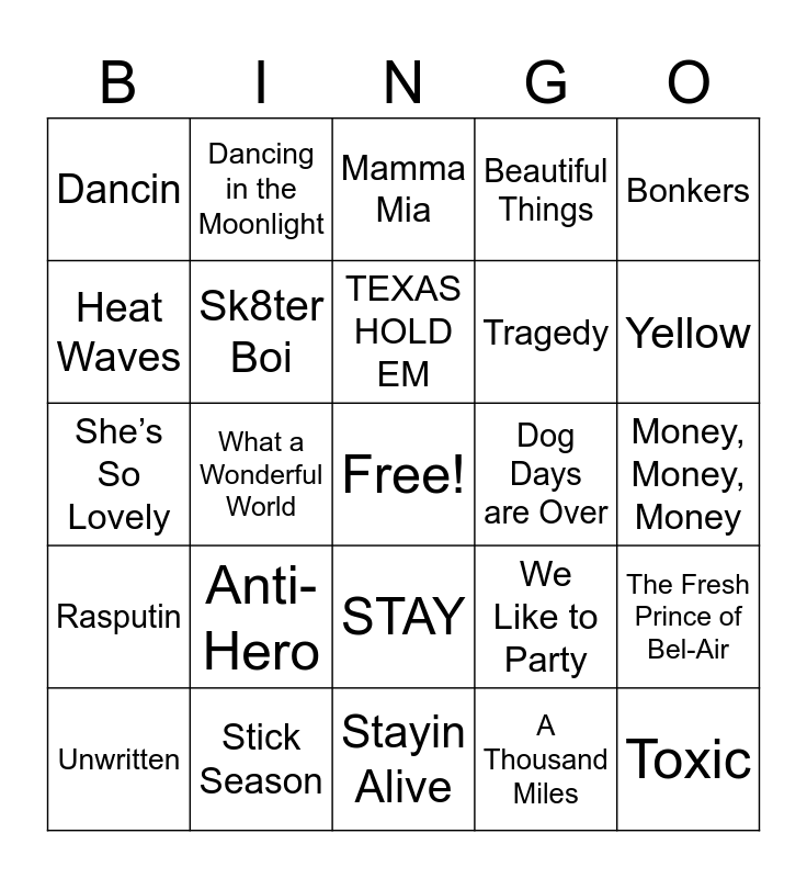 This bingo card has a free space and 25 words: Anti-Hero, Stayin Alive, TEXAS HOLD EM, Unwritten, Bonkers, Dancin, Heat Waves, Dancing in the Moonlight, Dog Days are Over, STAY, Tragedy, She’s So Lovely, We Like to Party, The Fresh Prince of Bel-Air, Sk8ter Boi, Dear Maria, Count me in, Money, Money, Money, Mamma Mia, Yellow, What a Wonderful World, Toxic, Stick Season, Rasputin, Beautiful Things and A Thousand Miles.