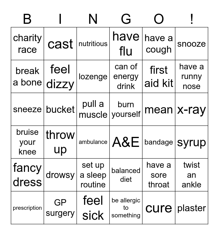 This bingo card has 36 words: balanced diet, set up a sleep routine, be allergic to something, break a bone, bruise your knee, burn yourself, feel dizzy, feel sick, have a cough, have a sore throat, have a runny nose, have flu, twist an ankle, bucket, can of energy drink, charity race, fancy dress, mean, sneeze, nutritious, pull a muscle, throw up, A&E, ambulance, bandage, cast, first aid kit, GP surgery, lozenge, snooze, plaster, prescription, syrup, x-ray, drowsy and cure.