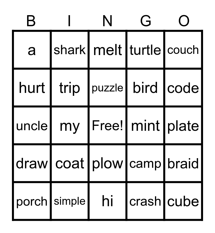 This bingo card has a free space and 31 words: hi, she, my, fly, a, melt, trip, camp, mint, crash, plate, cube, nice, stone, code, team, braid, coat, draw, plow, couch, her, porch, shark, bird, hurt, turtle, uncle, simple, puzzle and giggle.