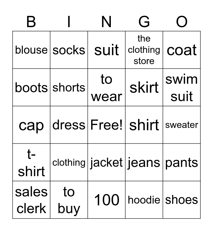 This bingo card has a free space and 24 words: clothing, to buy, to wear, sales clerk, coat, blouse, boots, socks, shirt, jacket, skirt, cap, jeans, pants, shorts, hoodie, sweater, suit, swim suit, dress, shoes, t-shirt, the clothing store and 100.