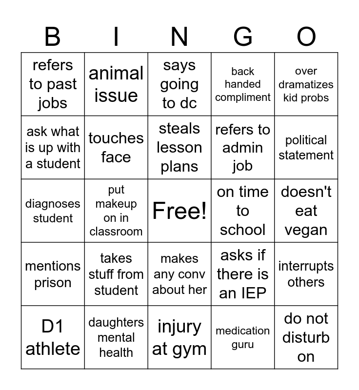 This bingo card has a free space and 24 words: takes stuff from student, daughters mental health, steals lesson plans, D1 athlete, over dramatizes kid probs, refers to past jobs, ask what is up with a student, animal issue, on time to school, makes any conv about her, refers to admin job, diagnoses student, asks if there is an IEP, interrupts others, touches face, medication guru, doesn't eat vegan, says going to dc, political statement, put makeup on in classroom, do not disturb on, mentions prison, back handed compliment and injury at gym.