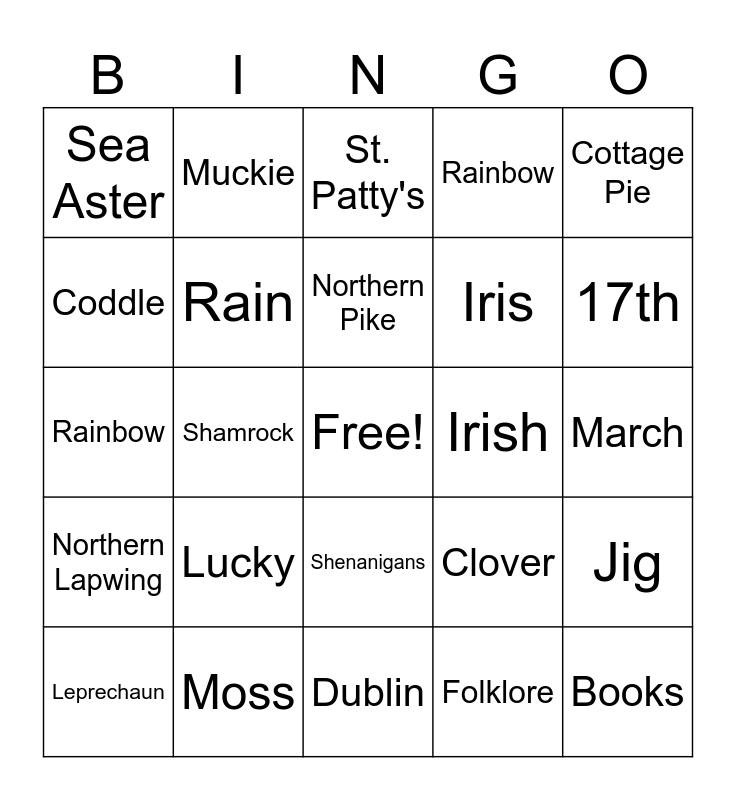 This bingo card has a free space and 29 words: Leprechaun, Gold, Shamrock, Pinch, Sea Aster, St. Patty's, Rain, Lucky, Irish, Moss, March, Books, Dublin, Folklore, 17th, Tulips, Shenanigans, Northern Lapwing, Cottage Pie, Rainbow, Clover, Malarky, Iris, Coddle, Rainbow, Muckie, Jig, Northern Pike and Cobble Stone.