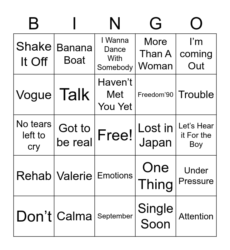 This bingo card has a free space and 63 words: Good Girl, Last Name, Texas Hold ‘Em, Under Pressure, You Rock My World, Leave Me Alone, Banana Boat, Killing Me Softly With His Songs, Haven’t Met You Yet, Love on Top, Emotions, How will I Know, Let’s Hear it For the Boy, I’m coming Out, I’m Every Woman, Vogue, Got to be real, Shake It Off, Right Round, Freedom’90, Valerie, Rehab, More Than A Woman, Hot Stuff, Conga, I Just Called To Say I Love You, FlashDance … what a feeling, Rocket Man, I’ll be there, Sweet Caroline, She works hard for the money, Jailhouse Rock, Rock -A-Hula Baby, Hound Dog, Trouble, Don’t, What Do you mean?, Single Soon, 2 Be Loved, Talk, No tears left to cry, Lost in Japan, Young Dumb a Broke, Halo, Attention, Calma, Paper Planes, One Thing, Nonsense, Never Really Over, Fireflies, September, You sexy thing, Wake Me Up Before You Go-Go, Uptown Girl, I Wanna Dance With Somebody, Blurred Lines, 34+35, Thank You Next, Rain On Me, Because I Got High, Thong Song and Murder On The Dance Floor.
