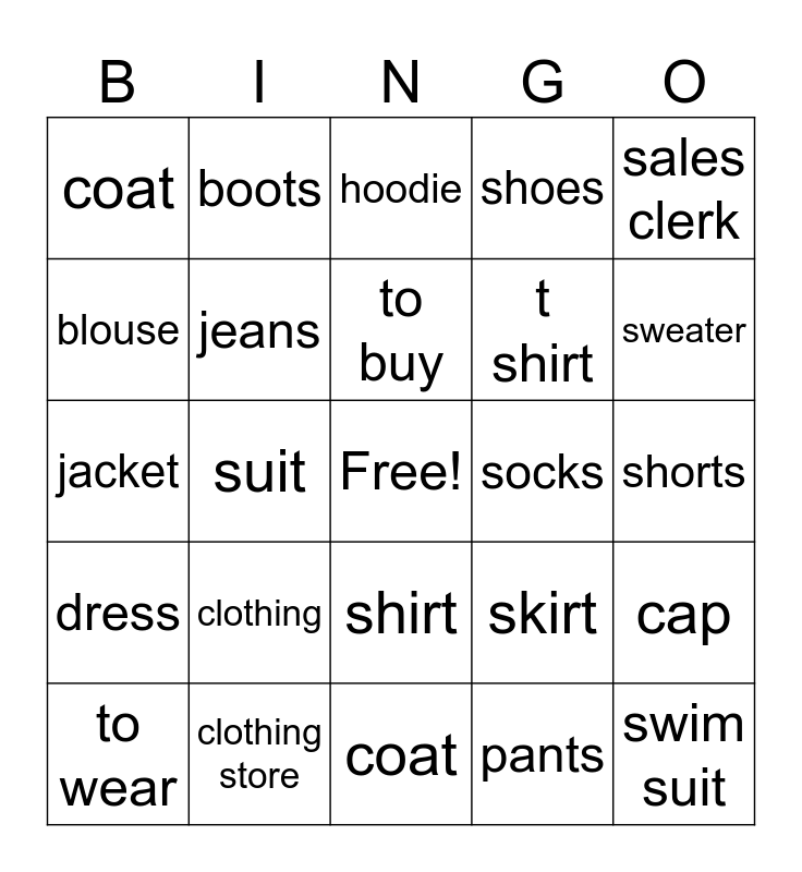 This bingo card has a free space and 24 words: clothing, clothing store, to buy, to wear, sales clerk, coat, blouse, boots, socks, shirt, t shirt, jacket, skirt, cap, jeans, pants, shorts, hoodie, sweater, suit, swim suit, dress, shoes and coat.