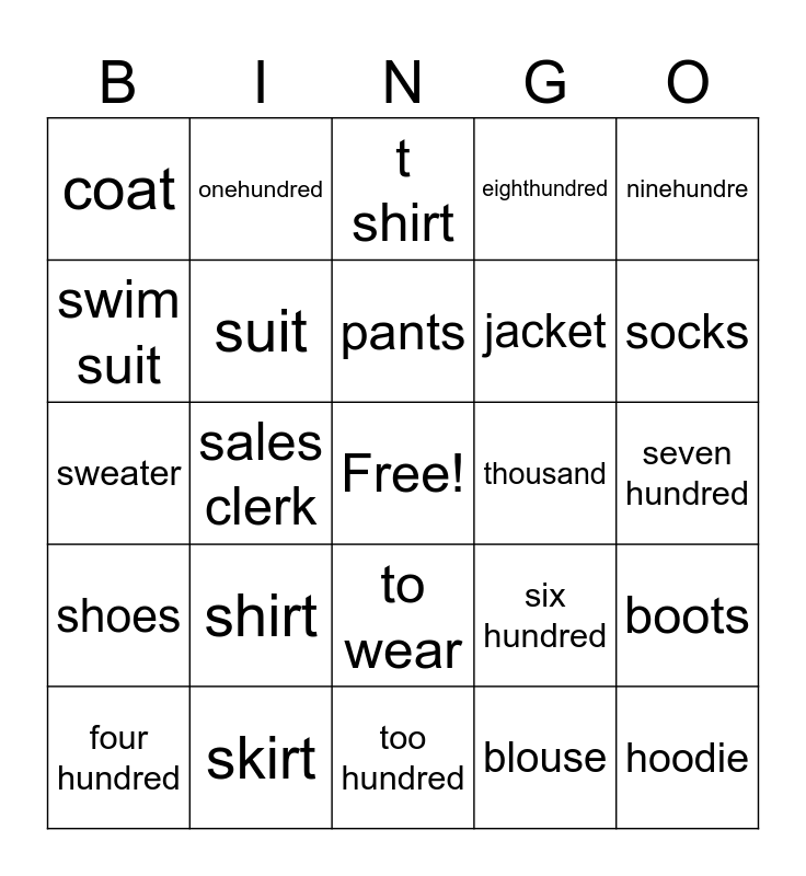 This bingo card has a free space and 24 words: shirt, skirt, pants, four hundred, ninehundre, coat, swim suit, onehundred, thousand, to wear, jacket, sweater, six hundred, boots, suit, blouse, seven hundred, t shirt, socks, sales clerk, hoodie, shoes, eighthundred and too hundred.