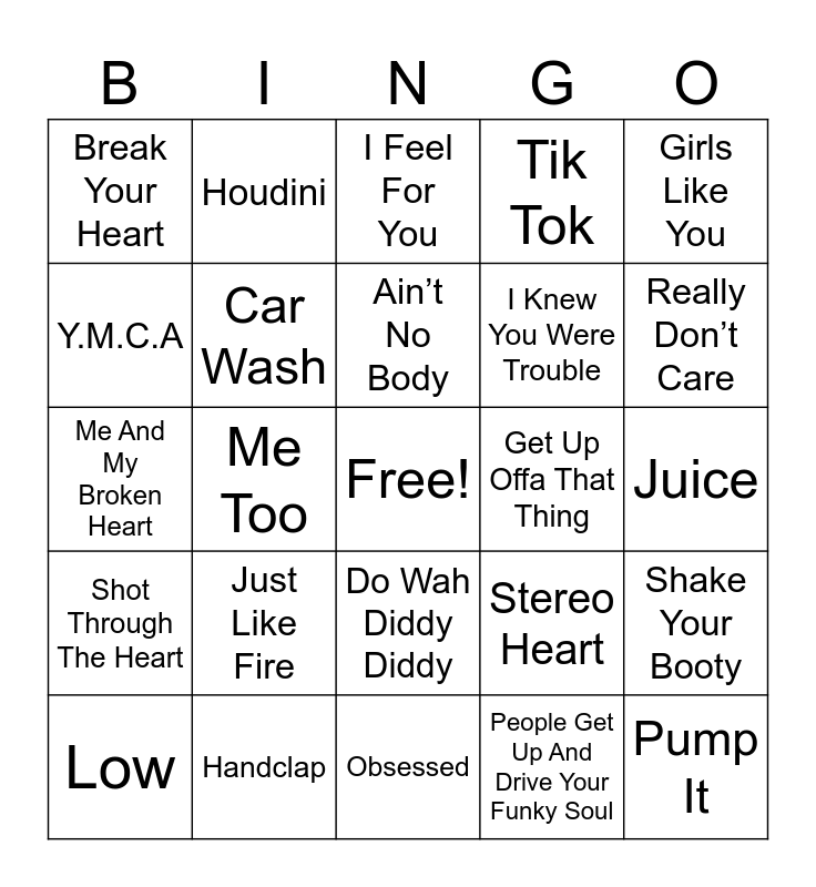 This bingo card has a free space and 72 words: Be Like This, Houdini, Me Too, Spicy Margarita, Choose Your Fighter, Baby Don’t Hurt Me, Tik Tok, Where Are You Now, I Knew You Were Trouble, Look What You Made Me Do, Low, The Edge Of Glory, Really Don’t Care, Break Your Heart, Baby, Me And My Broken Heart, Stereo Heart, Girls Like You, Misery, Juice, Just Like Fire, Pump It, Shake Your Booty, Lady Marmalade, Say Hey, Hot Hot Hot, Heartbeat Song, Lollipop, Anything Goes, Weatherman, Handclap, Bad Boys, Come On Get Happy, Bongo Cha Cha Cha, People Get Up And Drive Your Funky Soul, Mean Woman Blues, Rock The Boat, It’s Five O’Clock Somewhere, Y.M.C.A, Love IS a Battlefield, Do Wah Diddy Diddy, Disco Inferno, Tutti Frutti, Run The World, Welcome To The Jungle, Shot Through The Heart, Something Stupid, Where Everybody Knows Your Name, Just A Cloud Away, Walk Like An Egyptian, Walk Like A Dinosaur, Beggin, Rappers Delight, Get Up Offa That Thing, Super Freak, It’s Tricky, I Feel For You, Ain’t No Body, The Get Up, 1-2-3, Beer Never Broke My Heart ‘, Whoomp! There It Is, Fat Bottom Girls, Obsessed, Three Little Birds, Give Up The Funk, Car Wash, Don’t You Worry ‘Bout A Thing, Be Like That, I Got You, Land Of 1000 Dances and Tightrope.