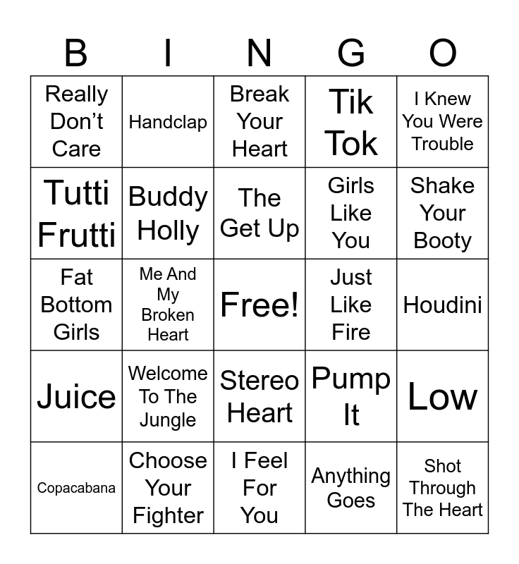 This bingo card has a free space and 70 words: Be Like This, Houdini, Me Too, Spicy Margarita, Choose Your Fighter, Baby Don’t Hurt Me, Tik Tok, Where Are You Now, I Knew You Were Trouble, Look What You Made Me Do, Low, The Edge Of Glory, Really Don’t Care, Break Your Heart, Baby, Me And My Broken Heart, Stereo Heart, Girls Like You, Misery, Juice, Just Like Fire, Pump It, Shake Your Booty, Lady Marmalade, Say Hey, Hot Hot Hot, Heartbeat Song, Lollipop, Anything Goes, Weatherman, Handclap, Bad Boys, Come On Get Happy, Bongo Cha Cha Cha, People Get Up And Drive Your Funky Soul, Mean Woman Blues, Rock The Boat, It’s Five O’Clock Somewhere, Disco Inferno, Tutti Frutti, Run The World, Welcome To The Jungle, Shot Through The Heart, Walk Like An Egyptian, Charlie Brown, Buddy Holly, Copacabana, Soul Bossa Nova, Walk Like A Dinosaur, Beggin, Rappers Delight, Get Up Offa That Thing, Super Freak, It’s Tricky, I Feel For You, Ain’t No Body, The Get Up, 1-2-3, Beer Never Broke My Heart ‘, Whoomp! There It Is, Fat Bottom Girls, Obsessed, Three Little Birds, Give Up The Funk, Car Wash, Don’t You Worry ‘Bout A Thing, Be Like That, I Got You, Land Of 1000 Dances and Tightrope.