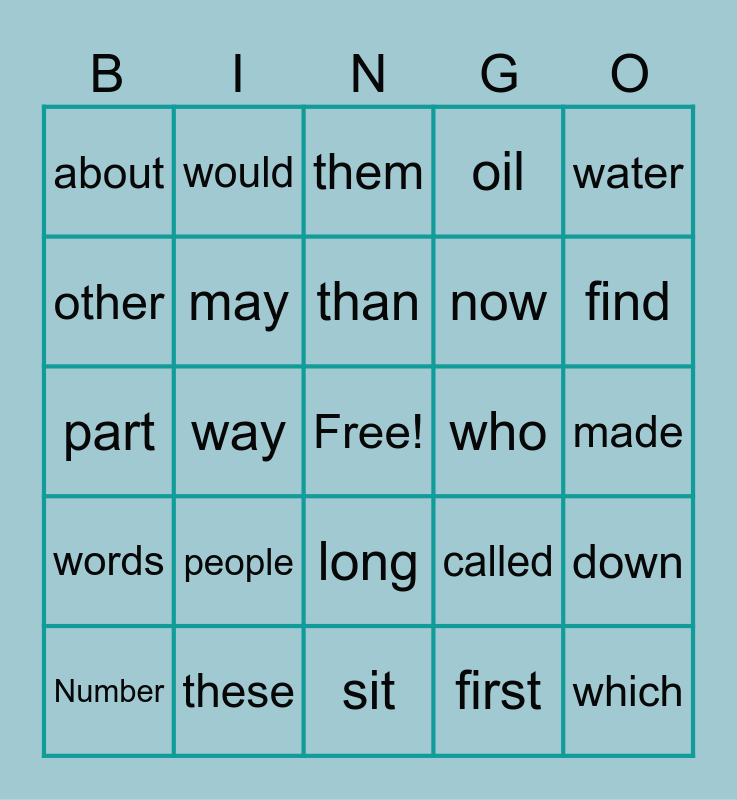 This bingo card has a free space and 24 words: Number, people, than, first, water, about, would, them, who, made, part, may, called, down, other, these, sit, oil, find, words, way, long, now and which.