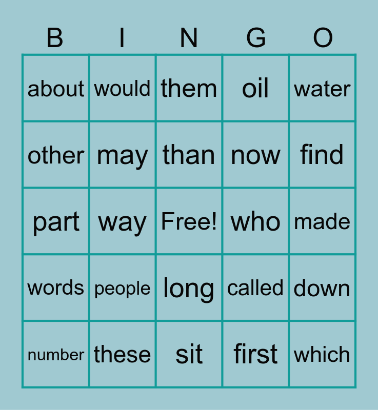 This bingo card has a free space and 24 words: number, people, than, first, water, about, would, them, who, made, part, may, called, down, other, these, sit, oil, find, words, way, long, now and which.
