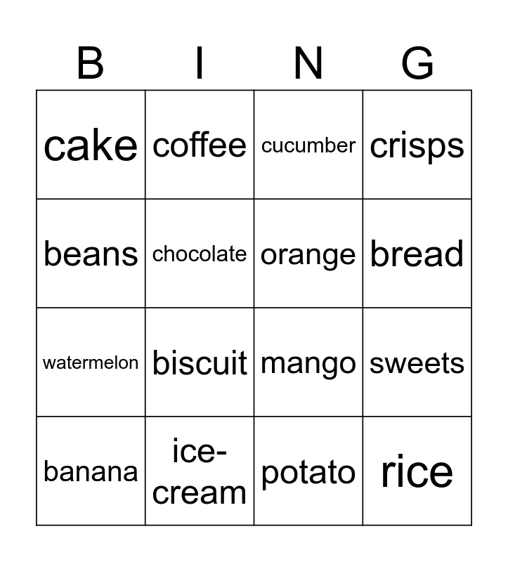 This bingo card has 26 words: cabbage, tomato, bread, lemonade, beans, cake, chocolate, coffee, potato, carrot, watermelon, mango, pepper, soy milk, sweets, onion, crisps, rice, cucumber, banana, biscuit, lettuce, ice-cream, strawberry, orange and pie.