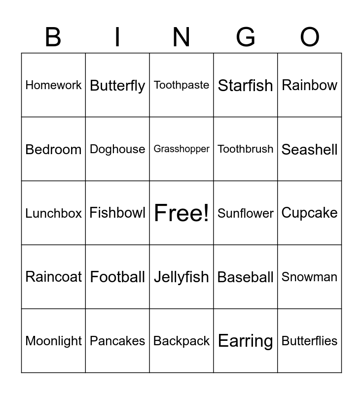 This bingo card has a free space and 24 words: Football, Pancakes, Grasshopper, Moonlight, Rainbow, Homework, Bedroom, Butterfly, Sunflower, Jellyfish, Toothbrush, Lunchbox, Baseball, Snowman, Doghouse, Earring, Cupcake, Toothpaste, Seashell, Fishbowl, Butterflies, Raincoat, Starfish and Backpack.