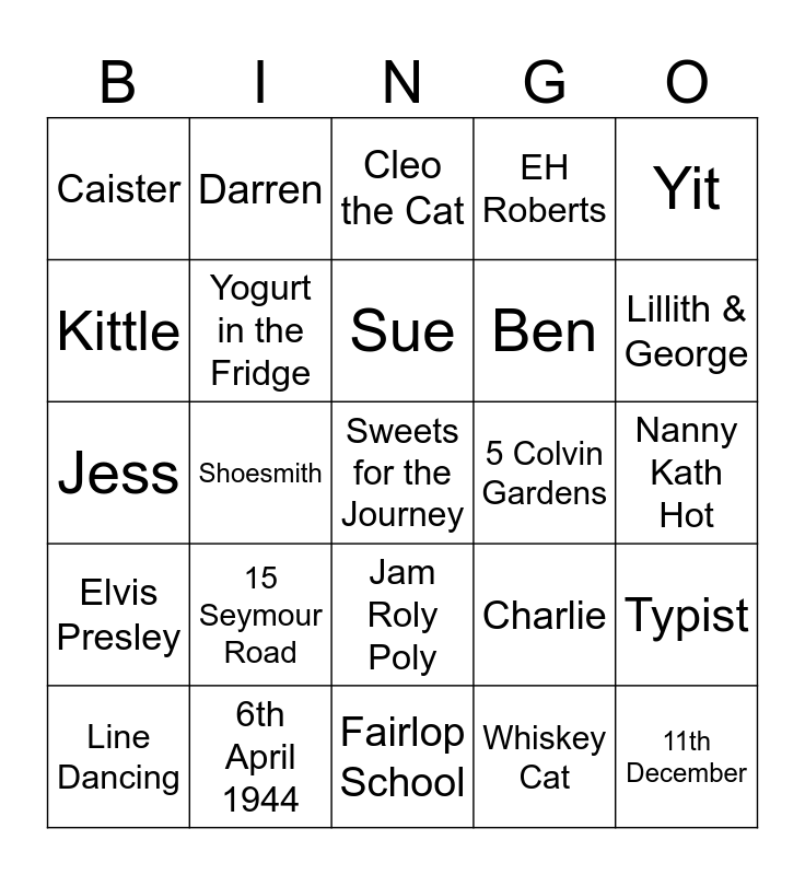 This bingo card has 25 words: 15 Seymour Road, Fairlop School, Sue, Line Dancing, Yit, Caister, Kittle, Darren, 5 Colvin Gardens, Jam Roly Poly, Ben, Jess, Charlie, Typist, Yogurt in the Fridge, 11th December, Nanny Kath Hot, Cleo the Cat, Lillith & George, Shoesmith, Sweets for the Journey, 6th April 1944, Elvis Presley, EH Roberts and Whiskey Cat.