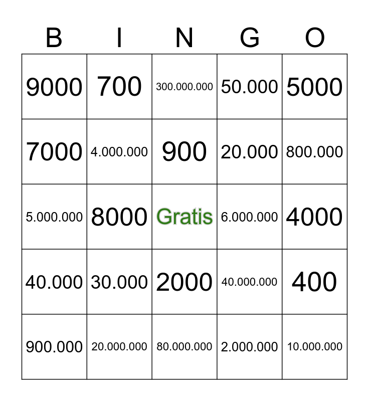 This bingo card has a free space and 64 words: 100, 200, 300, 400, 500, 600, 700, 800, 900, 1000, 2000, 3000, 4000, 5000, 6000, 7000, 8000, 9000, 10.000, 20.000, 30.000, 40.000, 50.000, 60.000, 70.000, 80.000, 90.000, 100.000, 200.000, 300.000, 400.000, 500.000, 600.000, 700.000, 800.000, 900.000, 1.000.000, 2.000.000, 3.000.000, 4.000.000, 5.000.000, 6.000.000, 7.000.000, 8.000.000, 9.000.000, 10.000.000, 20.000.000, 30.000.000, 40.000.000, 50.000.000, 60.000.000, 70.000.000, 80.000.000, 90.000.000, 100.000.000, 200.000.000, 300.000.000, 400.000.000, 500.000.000, 600.000.000, 700.000.000, 800.000.000, 900.000.000 and 1.000.000.000.