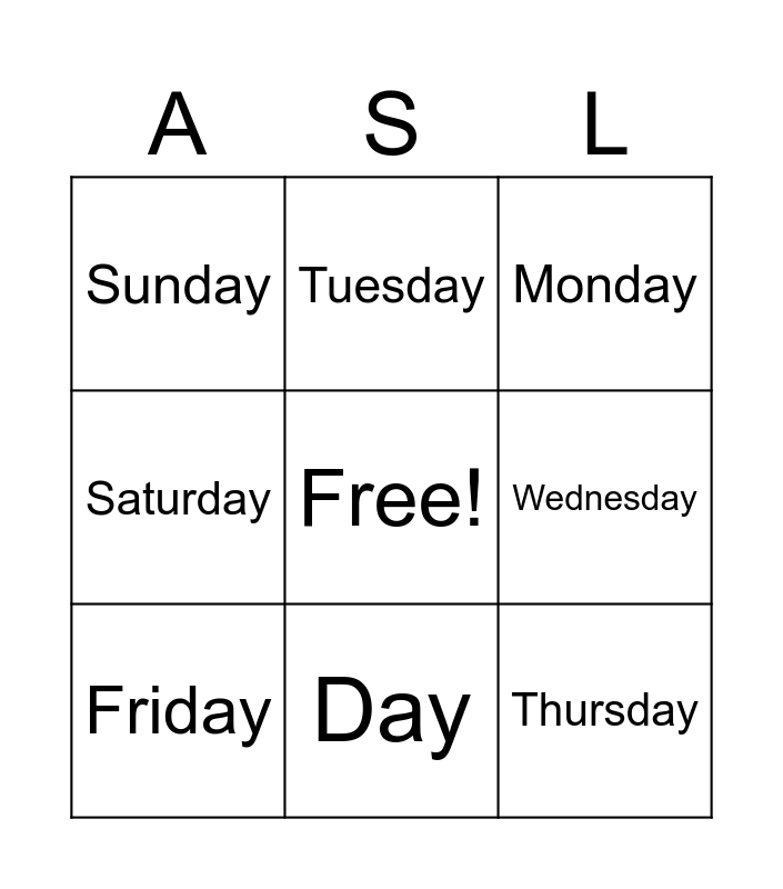 This bingo card has a free space and 8 words: Wednesday, Monday, Tuesday, Friday, Sunday, Thursday, Saturday and Day.