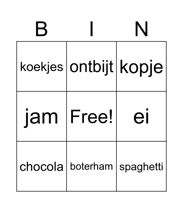 This bingo card has a free space and 30 words: appel, sinaasappel, brood, cake, koekjes, kopje, chocola, suiker, thee, theelepel, kaas, kauwgom, sap, avondeten, lunch, pasta, pizza, rijst, salade, spaghetti, peer, banaan, ontbijt, boter, ei, jam, melk, water, boterham and hapje.
