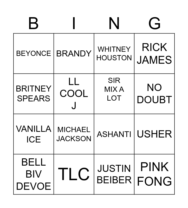 This bingo card has 16 words: TLC, USHER, WHITNEY HOUSTON, BEYONCE, VANILLA ICE, BRANDY, ASHANTI, JUSTIN BEIBER, BRITNEY SPEARS, LL COOL J, BELL BIV DEVOE, RICK JAMES, MICHAEL JACKSON, NO DOUBT, SIR MIX A LOT and PINK FONG.