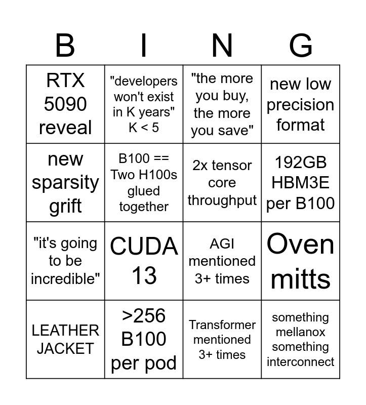 This bingo card has 16 words: >256 B100 per pod, Oven mitts, "the more you buy, the more you save", RTX 5090 reveal, "it's going to be incredible", "developers won't exist in K years" K < 5, AGI mentioned 3+ times, Transformer mentioned 3+ times, new sparsity grift, B100 == Two H100s glued together, LEATHER JACKET, new low precision format, CUDA 13, 192GB HBM3E per B100, 2x tensor core throughput and something mellanox something interconnect.