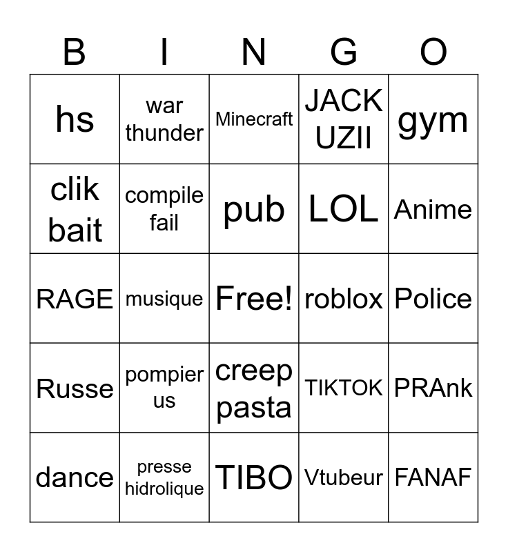 This bingo card has a free space and 24 words: pompier us, presse hidrolique, pub, dance, gym, hs, clik bait, war thunder, roblox, creep pasta, LOL, RAGE, TIKTOK, PRAnk, compile fail, Vtubeur, Police, Minecraft, Anime, musique, FANAF, Russe, JACK UZII and TIBO.