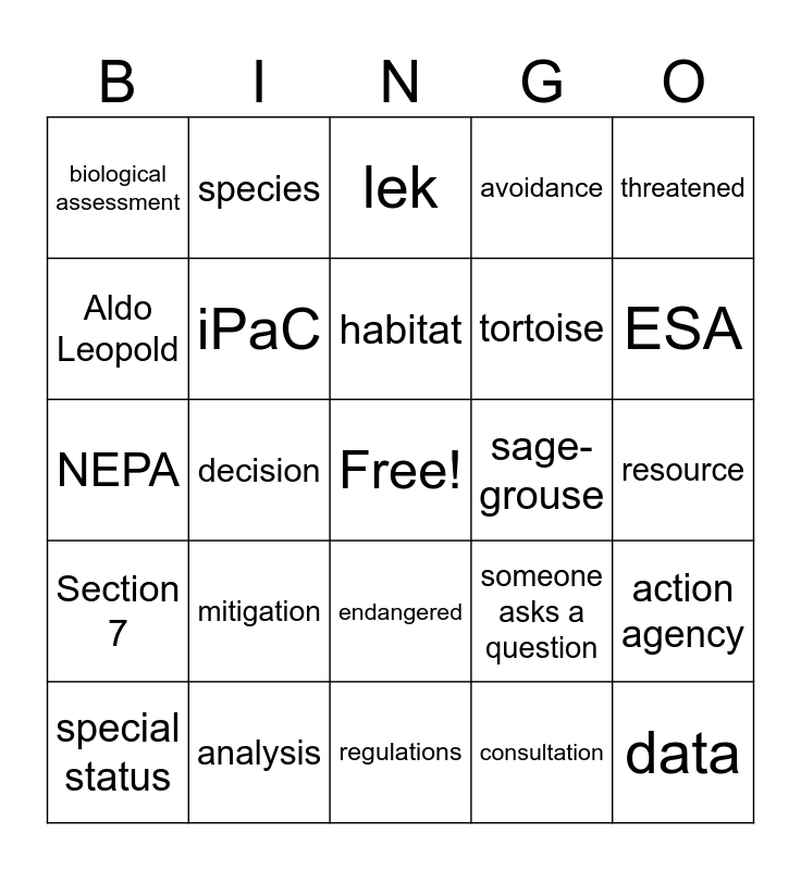 This bingo card has a free space and 24 words: mitigation, analysis, habitat, special status, threatened, biological assessment, Aldo Leopold, species, sage-grouse, endangered, tortoise, NEPA, someone asks a question, action agency, iPaC, consultation, resource, lek, ESA, decision, data, Section 7, avoidance and regulations.