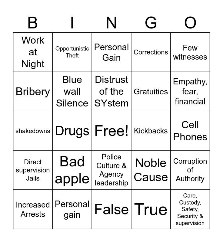 This bingo card has a free space and 24 words: Bad apple, Personal gain, Distrust of the SYstem, Increased Arrests, Few witnesses, Work at Night, Bribery, Opportunistic Theft, Kickbacks, Police Culture & Agency leadership, Gratuities, shakedowns, Noble Cause, Corruption of Authority, Blue wall Silence, True, Cell Phones, Personal Gain, Empathy, fear, financial, Drugs, Care, Custody, Safety, Security & supervision, Direct supervision Jails, Corrections and False.