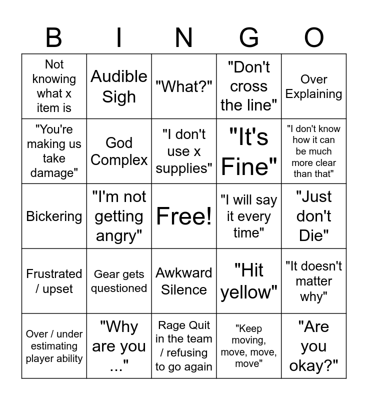 This bingo card has a free space and 24 words: Gear gets questioned, "Why are you ...", "I don't use x supplies", Over / under estimating player ability, Over Explaining, Not knowing what x item is, "You're making us take damage", Audible Sigh, "I will say it every time", Awkward Silence, "It's Fine", Bickering, "Hit yellow", "It doesn't matter why", God Complex, "Keep moving, move, move, move", "Just don't Die", "What?", "I don't know how it can be much more clear than that", "I'm not getting angry", "Are you okay?", Frustrated / upset, "Don't cross the line" and Rage Quit in the team / refusing to go again.