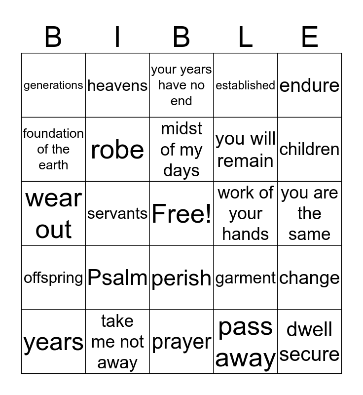 This bingo card has a free space and 24 words: Psalm, take me not away, midst of my days, years, endure, generations, foundation of the earth, heavens, work of your hands, perish, you will remain, wear out, garment, change, robe, pass away, you are the same, your years have no end, children, servants, dwell secure, offspring, established and prayer.