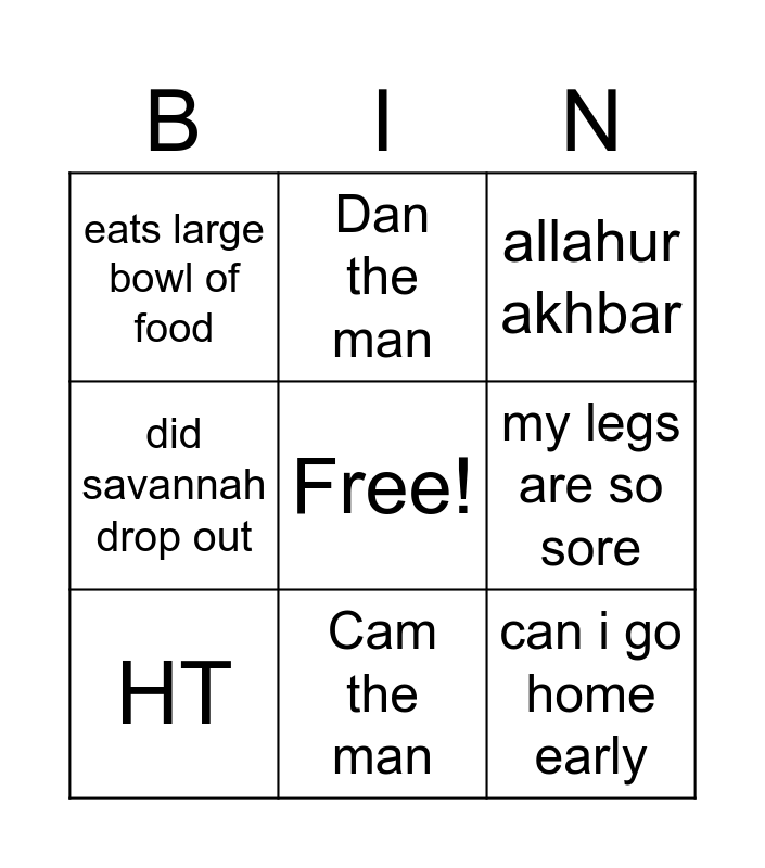 This bingo card has a free space and 8 words: my legs are so sore, allahur akhbar, Dan the man, HT, eats large bowl of food, can i go home early, did savannah drop out and Cam the man.