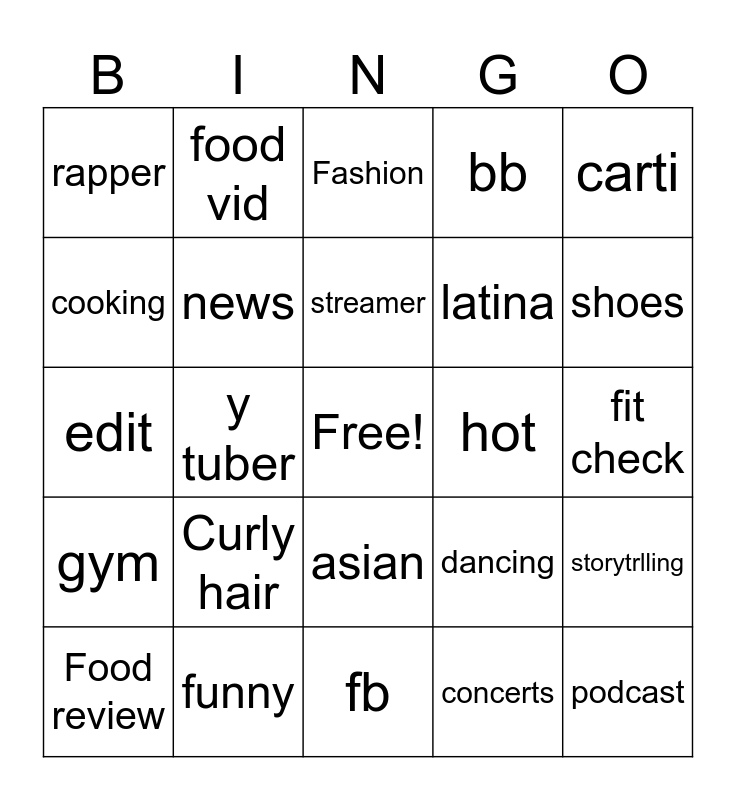 This bingo card has a free space and 24 words: Curly hair, funny, streamer, Food review, carti, rapper, cooking, food vid, hot, asian, latina, edit, dancing, storytrlling, news, concerts, fit check, Fashion, shoes, y tuber, podcast, gym, bb and fb.