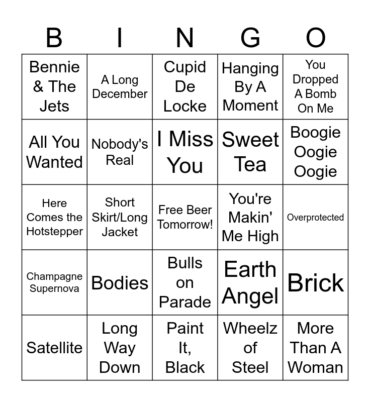 This bingo card has a free space and 53 words: Pass the Courvoisier Part II, More Than A Woman, What is Love, Wheelz of Steel, Bodies, Mr. Jones, A Long December, Crawling in the Dark, All You Wanted, Dr. Feelgood, Nobody's Real, Bailamos, Brick, Earth Angel, I Am a Man of Constant Sorrow, Satellite, I Miss You, You're Makin' Me High, Saturday (Oooh Oooooh!), You Dropped A Bomb On Me, Short Skirt/Long Jacket, The Distance, Sweet Tea, Bennie & The Jets, Across the Universe, Long Way Down, Lean On Me, Papa Loves Mambo, West Bound and Down, Boogie Oogie Oogie, Hella Good, Working for he Weekend, California Dreamin', Cosmic Girl, Faith, Can't Get You Outta My Head, Hanging By A Moment, Paint It, Black, Cupid De Locke, Walking on Broken Glass, Freedom!, Disco Inferno, Overprotected, Wanted Dead or Alive, Killing in the Name, Bulls on Parade, You Give Love A Bad Name, Without Me, Here Comes the Hotstepper, Champagne Supernova, Come Undone, Always and D'You Know What I Mean?.