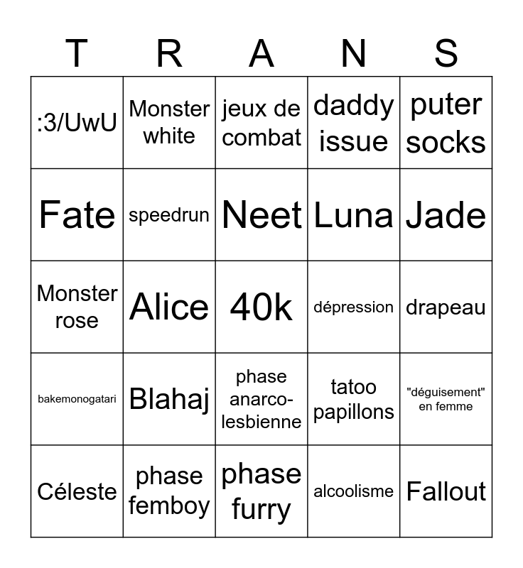 This bingo card has a free space and 24 words: Blahaj, phase femboy, Neet, Céleste, puter socks, :3/UwU, Fate, Monster white, dépression, phase anarco-lesbienne, Luna, Monster rose, tatoo papillons, "déguisement" en femme, speedrun, alcoolisme, drapeau, jeux de combat, Jade, Alice, Fallout, bakemonogatari, daddy issue and phase furry.