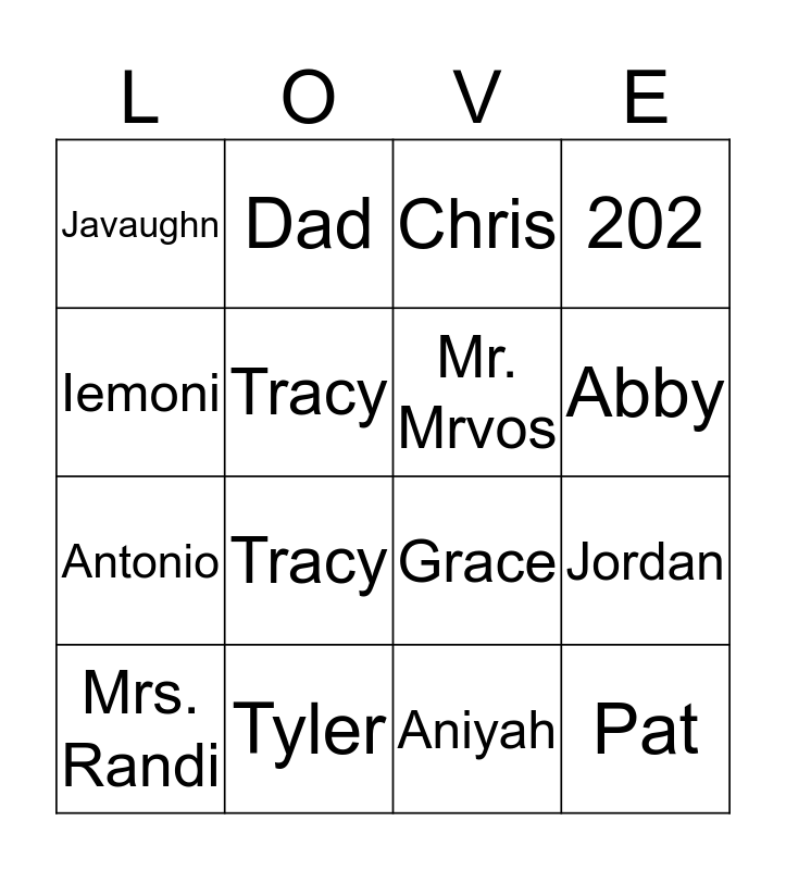 This bingo card has a free space and 15 words: Mrs. Randi, Pat, Chris, Javaughn, Abby, Iemoni, Tracy, Aniyah, Tracy, Antonio, Jordan, 202, Mr. Mrvos, Dad and Tyler.