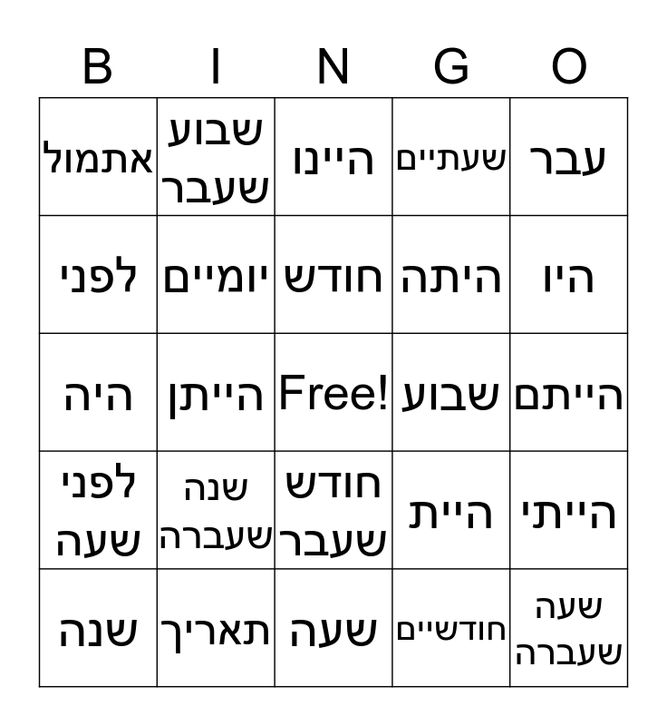 This bingo card has a free space and 24 words: שנה שעברה, תאריך, חודש, שנה, עבר, אתמול, לפני, שבוע שעבר, שבוע, חודש שעבר, היתה, היה, היית, הייתי, יומיים, חודשיים, הייתם, היינו, היו, הייתן, שעה שעברה, לפני שעה, שעתיים and שעה.