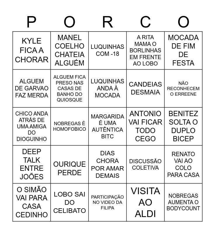 This bingo card has a free space and 44 words: MARIA SAI DO CELIBATO, NOBREGAS AUMENTA O BODYCOUNT, NOBREGAS SIMPA E FALHA, O SIMÃO VAI PARA CASA CEDINHO, TOSTAS DO MUNDIAL, VISITA AO ALDI, LUQUINHAS COM -18, MALUCO ATRAS DA MARGARIDA, MOCADA DE FIM DE FESTA, LOBO SAI DO CELIBATO, A RITA MAMA O BORLINHAS EM FRENTE AO LOBO, ANTONIO VAI FICAR TODO CEGO, DIAS CHORA POR AMAR DEMAIS, OURIQUE PERDE, RENATINHO EVITA A MARIA, PARTICIPAÇÃO NO VIDEO DA FILIPA, TIO CRIS ASSEDIA ALGUMA RAPARIGA, CHICO ANDA ATRÁS DE UMA AMIGA DO DIOGUINHO, DAVID VAI ROUBAR ALGUÉM, NÃO RECONHECEM O ERREENE, MANEL COELHO CHATEIA ALGUÉM, SAMUKA EMPATA FODAS, SAMUKA VENDE ESQUEMA EM PIRAMIDE, KYLE FICA A CHORAR, O RISCO DESAPARECE, BENITEZ SOLTA O DUPLO BICEP, DAVID CHEGA ATRASADO PORQUE ESTA A JANTAR EM SANTANA, ALGUÉM DE PANOIAS FAZ MERDA, DISCUSSÃO COLETIVA, DEEP TALK ENTRE JOÕES, MARIA E MARGARIDA IMPORTUNAM O SEGURANÇA, RENATO VAI AO COLO PARA CASA, KIKI MELOSO, SOFIA AGRIDE GABZODA, NOBREGAS É HOMOFOBICO, BELG VAI DE GAP, PILAU CONTRATA PUTAS, DIOGUINHO APRESENTA A NAMORADA AO CRIS, LUQUINHAS ANDA À MOCADA, ALGUEM DE GARVAO FAZ MERDA, CANDEIAS DESMAIA, MARIA TIRA FOTO COM A MARIANA RAMOS, ALGUEM FICA PRESO NAS CASAS DE BANHO DO QUIOSQUE and LEONOR PATO E NOBREGAS BATEM PAPO.