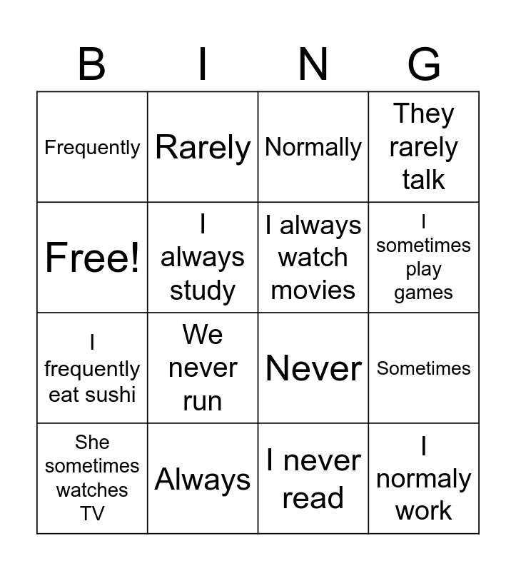 This bingo card has 16 words: Always, Sometimes, Normally, Frequently, I frequently eat sushi, Rarely, Never, I never read, Free!, I always study, She sometimes watches TV, They rarely talk, We never run, I sometimes play games, I always watch movies and I normaly work.