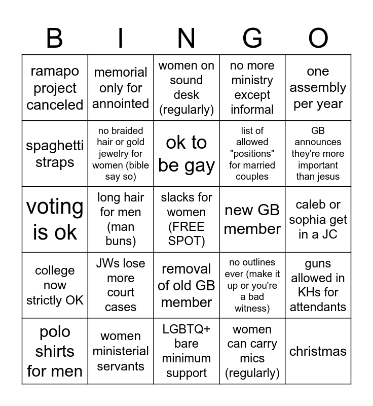 This bingo card has a free space and 44 words: birthdays, christmas, flip flops at the KH, polo shirts for men, jeans for men, women can carry mics (regularly), women on sound desk (regularly), no more midweek meeting, one assembly per year, women ministerial servants, no more ministry except informal, new GB member, removal of old GB member, JWs lose more court cases, DFing ONLY apostates, LGBTQ+ bare minimum support, blood transfusions conscience matter, voting is ok, new GB appreciation day JW holiday, GB announces they're more important than jesus, memorial only for annointed, split in the religion, ramapo actually opens, ramapo project canceled, watchtower no longer has commenting, just reading the paragraphs, caleb or sophia get in a JC, no more printed literature for ministry, outlines for everything (do not use your own material), no outlines ever (make it up or you're a bad witness), college now strictly OK, minimum baptism age, guns allowed in KHs for attendants, guns strictly banned for all JWs, tattoos now strictly OK (as long as its not something "bad"), long hair for men (man buns), infant baptism, one woman on a JC as the committee member, trans acceptance, ok to be gay, spaghetti straps, list of allowed "positions" for married couples, list of banned "positions" for married couples, no braided hair or gold jewelry for women (bible say so) and "have more kids" announcement.