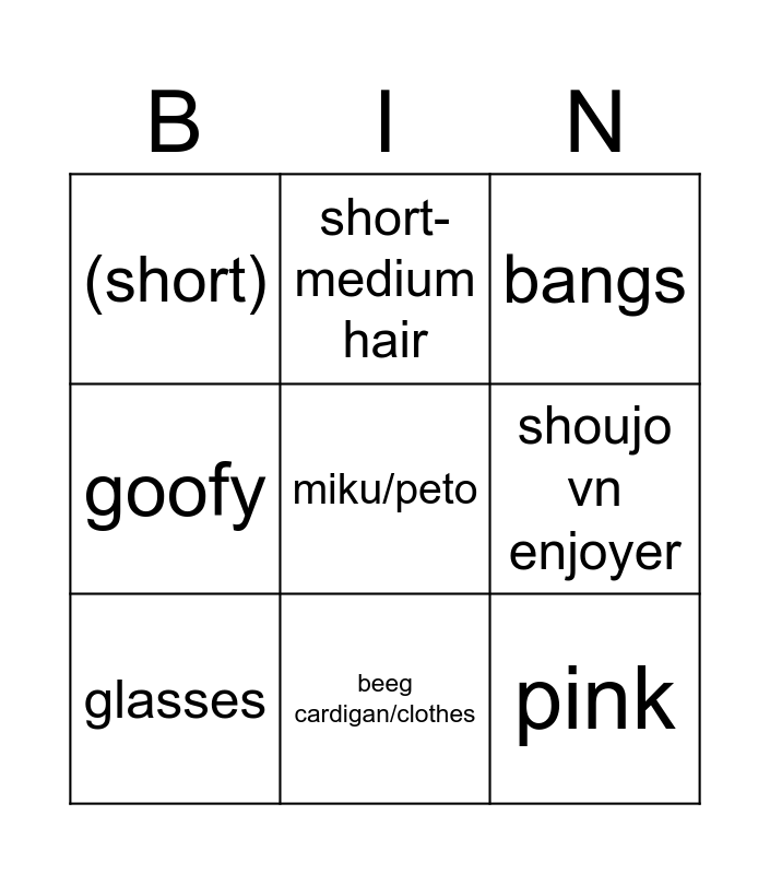 This bingo card has 9 words: glasses, bangs, short-medium hair, goofy, (short), shoujo vn enjoyer, miku/peto, pink and beeg cardigan/clothes.