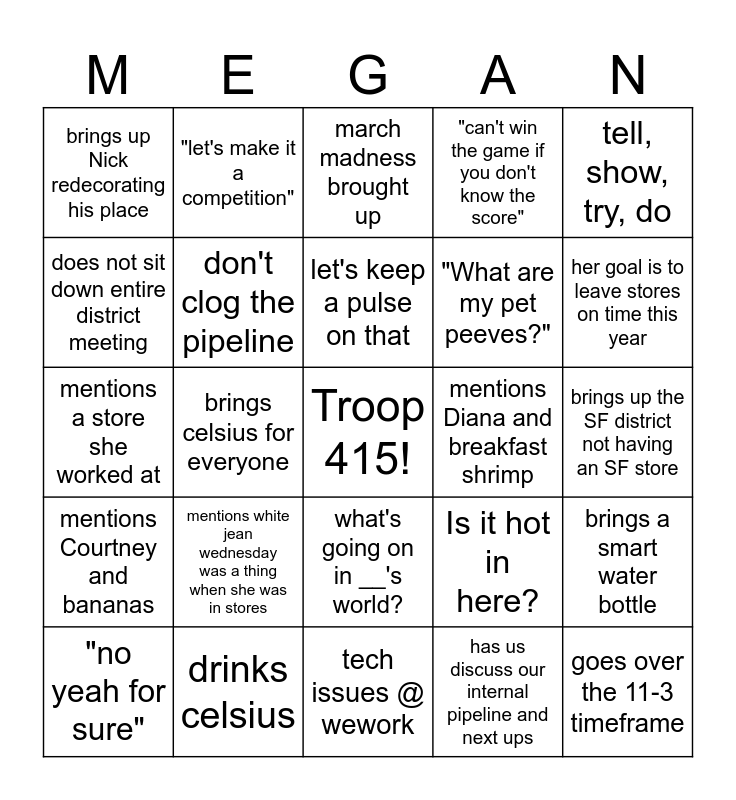 This bingo card has a free space and 27 words: Is it hot in here?, "chunky mama" or sweet baby lo or lo's diet mentioned, "What are my pet peeves?", tech issues @ wework, does not sit down entire district meeting, march madness brought up, "let's make it a competition", mentions Courtney and bananas, mentions Diana and breakfast shrimp, brings a smart water bottle, mentions a store she worked at, "can't win the game if you don't know the score", "no yeah for sure", drinks celsius, her goal is to leave stores on time this year, "questions, comments, concerns, compliments?, don't clog the pipeline, let's keep a pulse on that, mentions white jean wednesday was a thing when she was in stores, brings up Nick redecorating his place, brings up the SF district not having an SF store, has us discuss our internal pipeline and next ups, brings celsius for everyone, goes over the 11-3 timeframe, what's going on in __'s world?, tell, show, try, do and "you should see the APAC stores..".