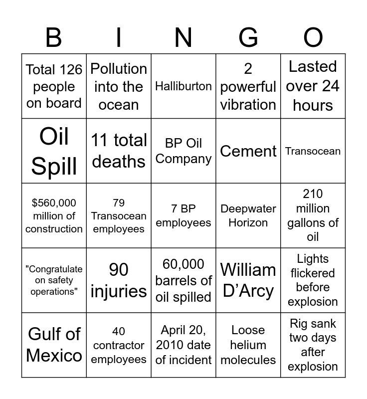 This bingo card has 1 images and 25 words: 90 injuries, April 20, 2010 date of incident, BP Oil Company, Gulf of Mexico, Lasted over 24 hours, Total 126 people on board, Oil Spill, Pollution into the ocean, Deepwater Horizon, 60,000 barrels of oil spilled, Cement, $560,000 million of construction, William D’Arcy, Lights flickered before explosion, 11 total deaths, Rig sank two days after explosion, 210 million gallons of oil, Halliburton, Transocean, 79 Transocean employees, 7 BP employees, 40 contractor employees, "Congratulate on safety operations", 2 powerful vibration and Loose helium molecules.