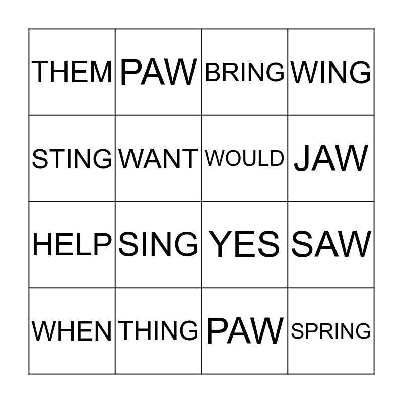 This bingo card has 16 words: THING, SAW, BRING, THEM, HELP, PAW, YES, PAW, STING, WANT, WHEN, WING, SING, JAW, WOULD and SPRING.
