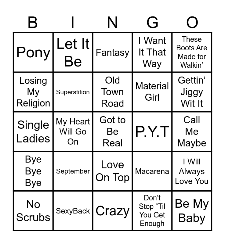 This bingo card has 91 words: Free!, Uptown Funk, Love On Top, Shape of You, Diamonds, Dark Horse, Rolling in the Deep, Happy, Despacito, Somebody That I Used to Know, Blank Space, Party Rock Anthem, Formation, Call Me Maybe, Hello, Old Town Road, Hey Ya!, I Gotta Feeling, Lose Yourself, My Boo, Yeah!, Crazy In Love, Crazy, Whenever, Wherever, Single Ladies, SexyBack, Umbrella, Toxic, Low, Feel Good Inc, We Belong Together, I Will Always Love You, Smells Like Teen Spirit, Bye Bye Bye, Pony, I Want It That Way, Fantasy, Livin’ la Vida Loca, My Heart Will Go On, Gettin’ Jiggy Wit It, No Scrubs, Losing My Religion, Wonderwall, Say My Name, Wannabe, Macarena, Billie Jean, Every Breath You Take, Sweet Child O’ Mine, I Love Rock ‘N Roll, Livin’ On A Prayer, Material Girl, Girls Just Want to Have Fun, Jump, Beat It, Running Up That Hill, P.Y.T, If I Could Turn Back Time, Like a Virgin, I Wanna Dance with Somebody, Kiss, Bohemian Rhapsody, Hot Stuff, Stayin Alive, Piano Man, This Will Be (An Everlasting Love), Stairway to Heaven, Don’t Stop “Til You Get Enough, American Pie, Hopelessly Devoted Yo You, September, Got to Be Real, Jolene, I Will Survive, Let It Be, Superstition, Hey Jude, I Heard It Through The Grapevine, Respect, Like a Rolling Stone, Be My Baby, These Boots Are Made for Walkin’, At Last, (You Make Me Feel Like) A Natural Woman, My Girl, L-O-V-E, Ain’t No Mountain High Enough, (I Can’t Get No) Satisfaction, Oh, Pretty Woman, Can’t Help Falling In Love and Here Comes the Sun.