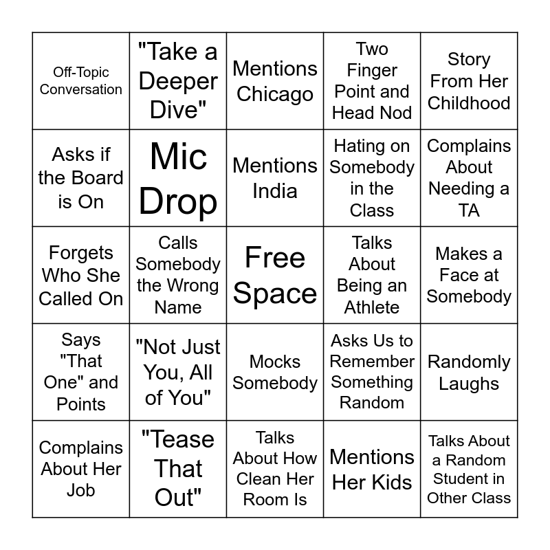This bingo card has a free space and 32 words: Mentions Her Kids, Talks About Switching Schools Next Year, Calls Somebody the Wrong Name, Lies About Her Past Jobs, Says "That One" and Points, Mic Drop, Story From Her Childhood, Randomly Laughs, "Take a Deeper Dive", Plays Devil's Advocate, Mentions India, Mentions Chicago, Complains About People Not Taking Notes, "Snap it Out", Talks About Being an Athlete, Mentions Command Terms, Complains About Her Job, Forgets Who She Called On, Mocks Somebody, "Not Just You, All of You", Asks Us to Remember Something Random, Mentions the Stuff on the Walls, Makes a Face at Somebody, "Tease That Out", Talks About a Random Student in Other Class, Two Finger Point and Head Nod, Hating on Somebody in the Class, Asks if the Board is On, Off-Topic Conversation, Talks About How Clean Her Room Is, “Read the Board” and Complains About Needing a TA.